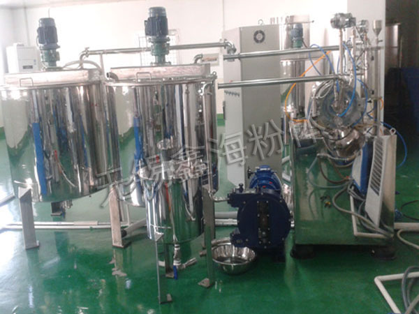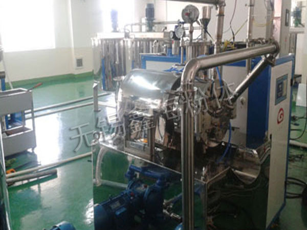 加料泵將預(yù)分散的材料送人研磨桶,研磨筒內(nèi)裝有研磨介質(zhì),磨細(xì)后的物料經(jīng)動(dòng)態(tài)分離器排出,視產(chǎn)品細(xì)度不同,可采用單臺(tái)連續(xù)或多臺(tái)串聯(lián)連續(xù)研磨工藝。